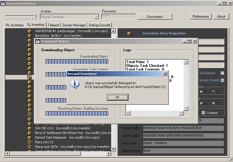 I have read on different locations some concerns about creator’s copyrights. This tool has been designed in order to protect those rights by not allowing any backup of stuff one hasn’t created like objects/scripts/skins/textures. Although this is really great for those who wish to have their goods protected, it really is a setback for all those searching a solution which would cover all inventory (created+acquired).